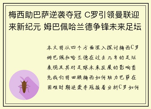 随着2025年新赛季的到来,足球世界迎来了一则震撼的消息——克里斯蒂亚诺·罗纳尔多(C罗)重返曼联,开启了职业生涯的新篇章。C罗作为世界足坛的超级巨星,他的回归不仅让曼联球迷欣喜若狂,也让全球球迷充满期待。本文将从四个方面详细阐述C罗重返曼联的深远意义,以及这对曼联全新赛季所带来的影响。通过分析C罗...